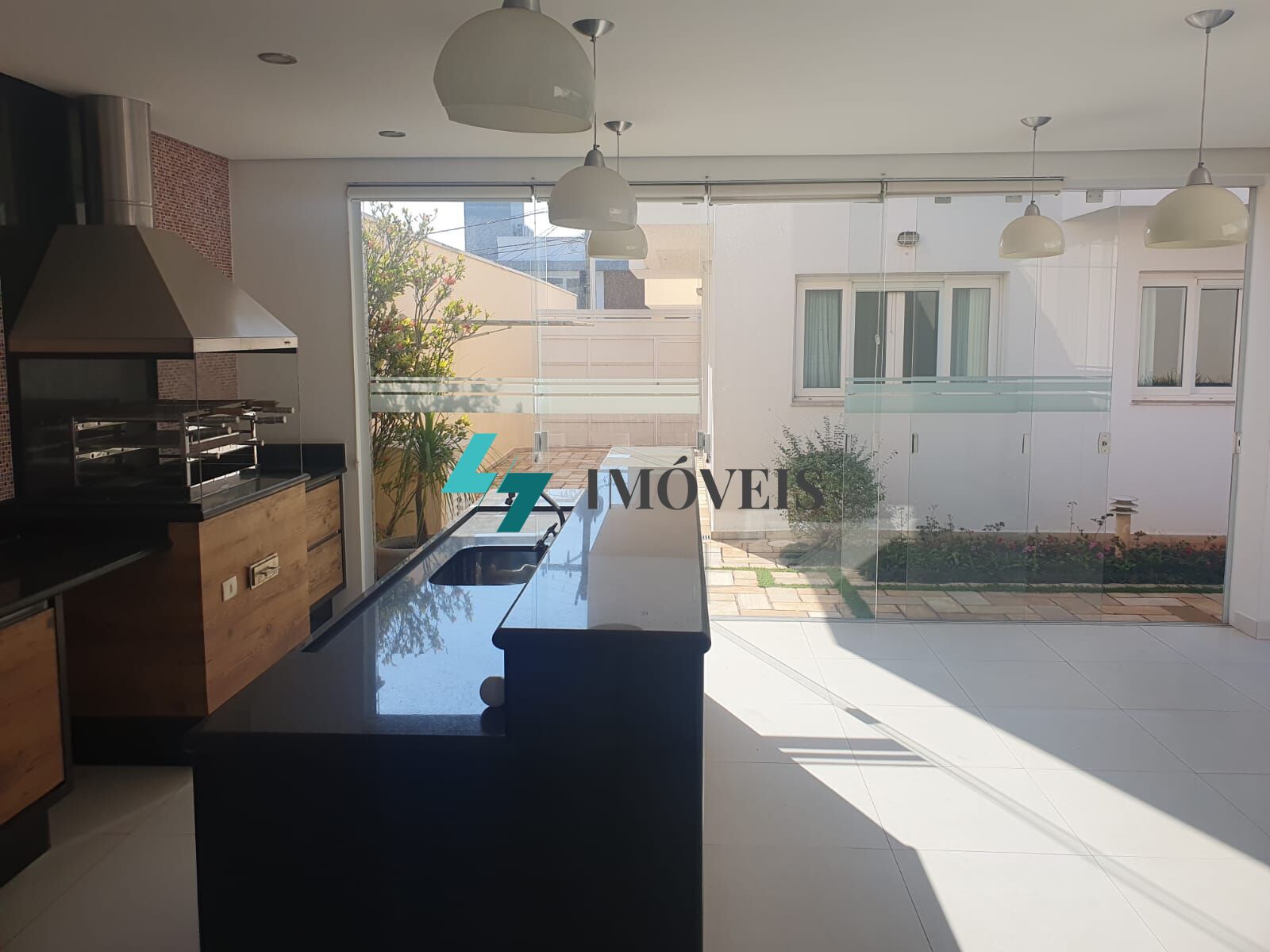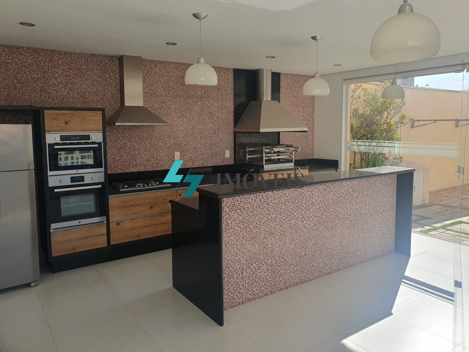 Área Gourmet em ambiente fechado com vidros deslizantes temperados ; com churrasqueira elétrica com coifa em aço inox; armários planejados; balcão em granito; pia com gabinete; fogão, geladeira e forno elétrico e geladeira; revestimento em pastilhas; banheiro e piscina com fechamento com cerca em alumínio.