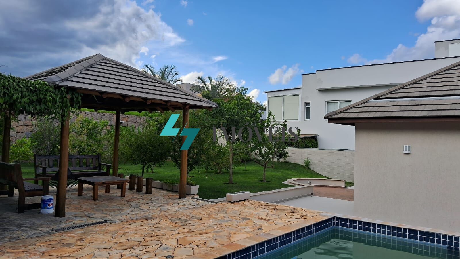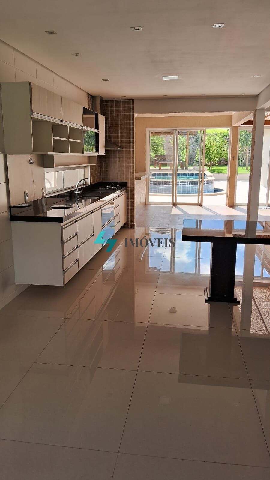 Sala com 3 ambientes em conceito aberto, integrada com a cozinha e área gourmet. Cozinha planejada e toda equipada com os eletrodomésticos, despensa e lavanderia com armários planejados. Mezanino, escritório, sala de TV que pode também ser transformado e mais um dormitório. Área gourmet com churrasqueira, forno de pizza, balcão e pia em granito, fechamento com portas deslizantes em alumínio com pintura eletrostática e vidros transparentes. Piscina e quiosque com cobertura em telha, integrados a um amplo quintal com pomar com algumas árvores frutíferas.