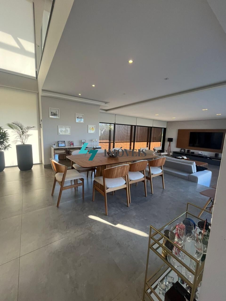 • Sala de estar ampla com pé direito duplo, integrada com sala de jantar e cozinha com fino acabamento, um amplo espaço gourmet com churrasqueira