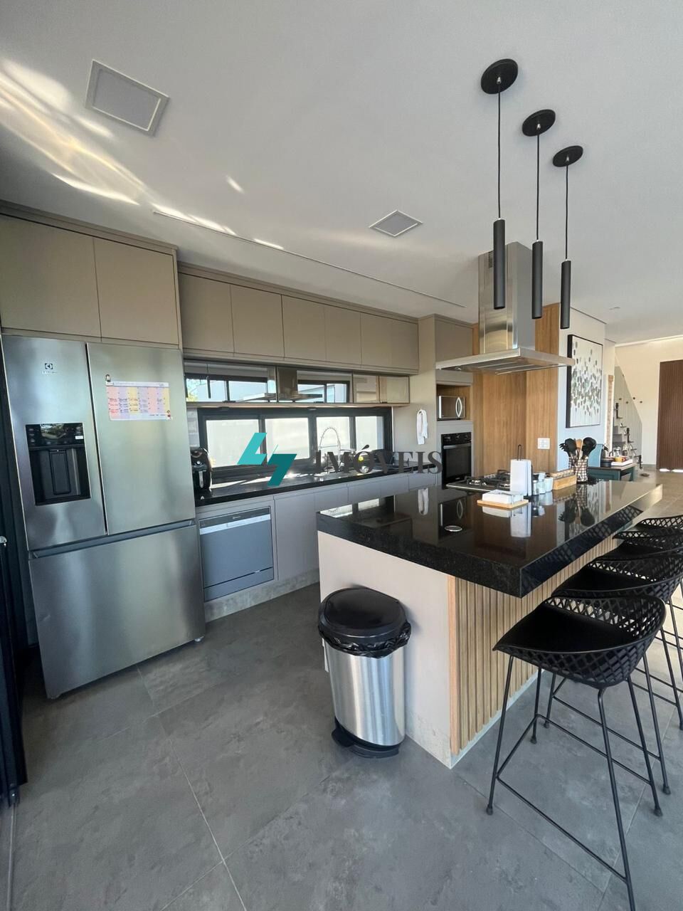 • Cozinha moderna e equipada com armários embutidos, uma ilha com cooktop coifa, além de ampla despensa para armazenamento